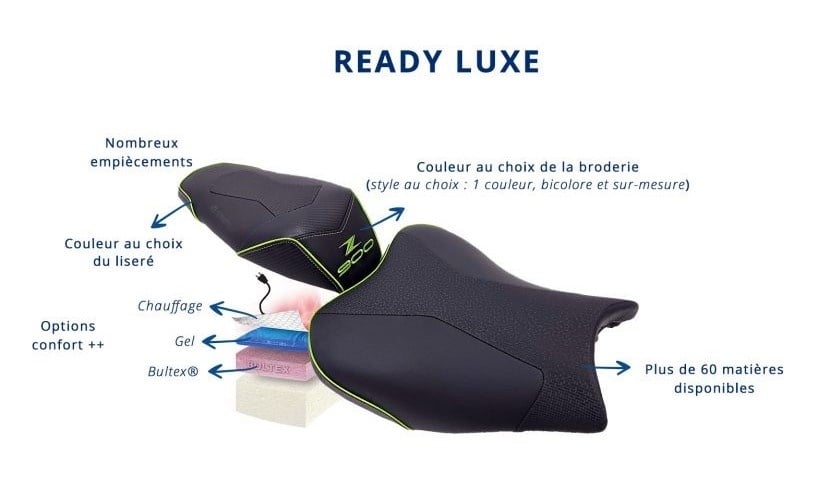 Elke zadelunit wordt afgewerkt met een met de hand vervaardigde hoes uit het atelier in Normandië. Hierbij worden premium materialen, hoogwaardige afwerkingen en exclusieve borduursels gebruikt, waardoor jouw motor een unieke en persoonlijke uitstraling krijgt.